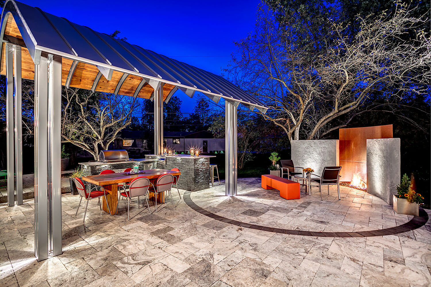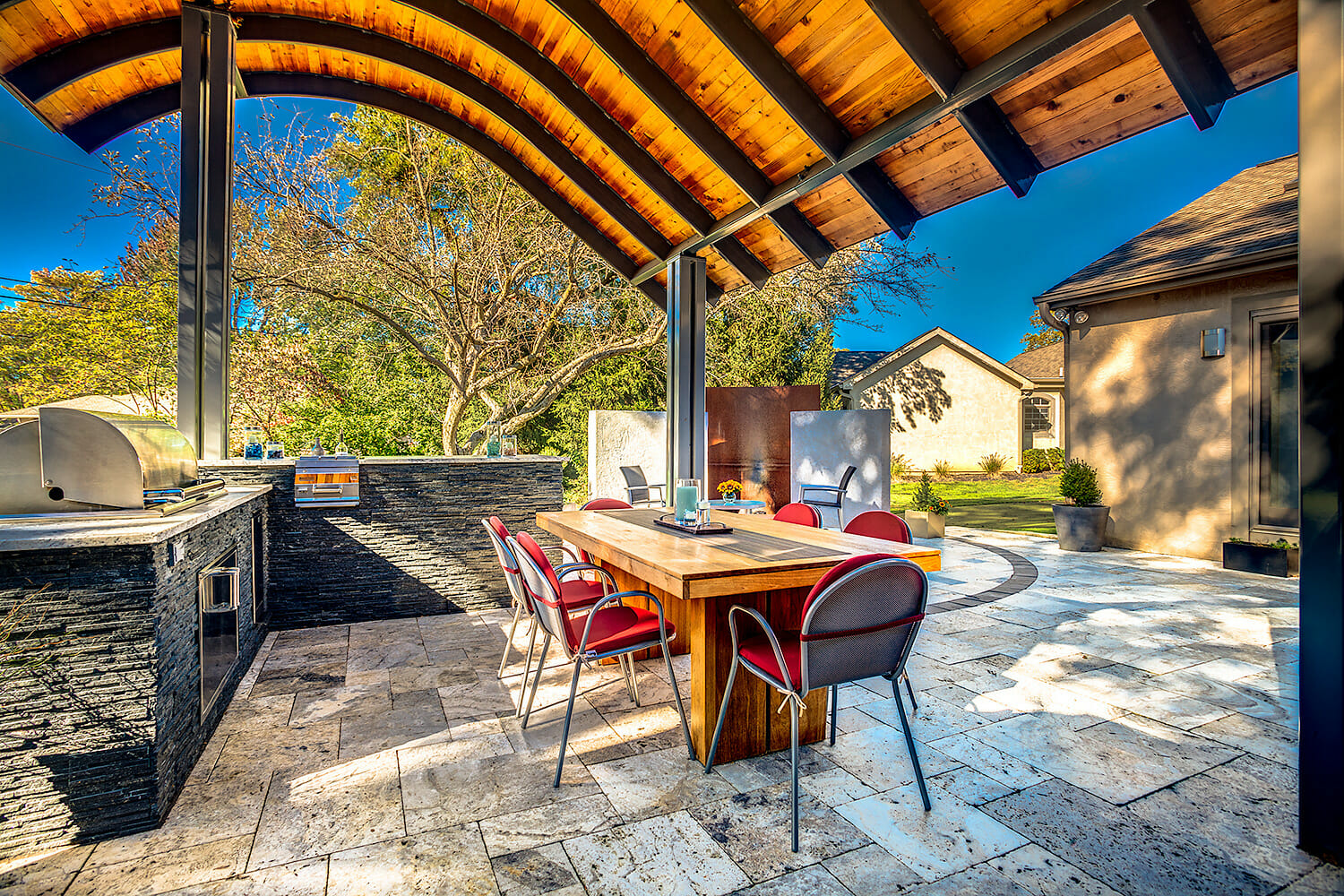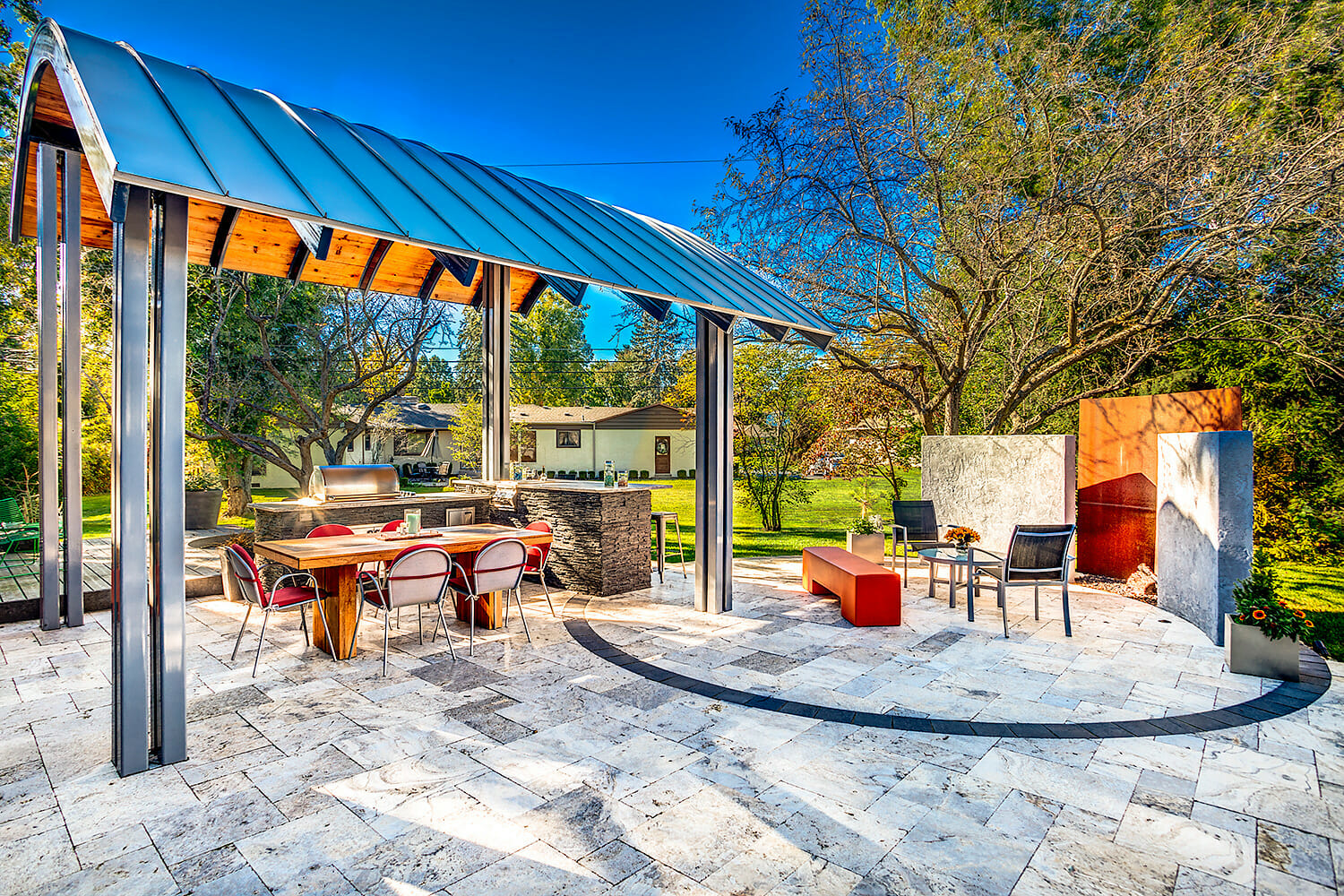 This once bland outdoor living space was transformed into an award winning show stopper by seamlessly blending the homeowner’s modern architectural style with the landscape. Unique features such as a corten steel fire feature and a curved roof structure provide the setting for this upscale entertaining space. The new patio was constructed of silver travertine with black brick accents, complimented by an outdoor kitchen made of like materials. Cedar planking was used on the underside of the roof structure to provide warmth and richness to an otherwise cold space. This new outdoor room is sure to wow for years to come!