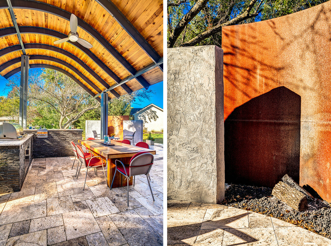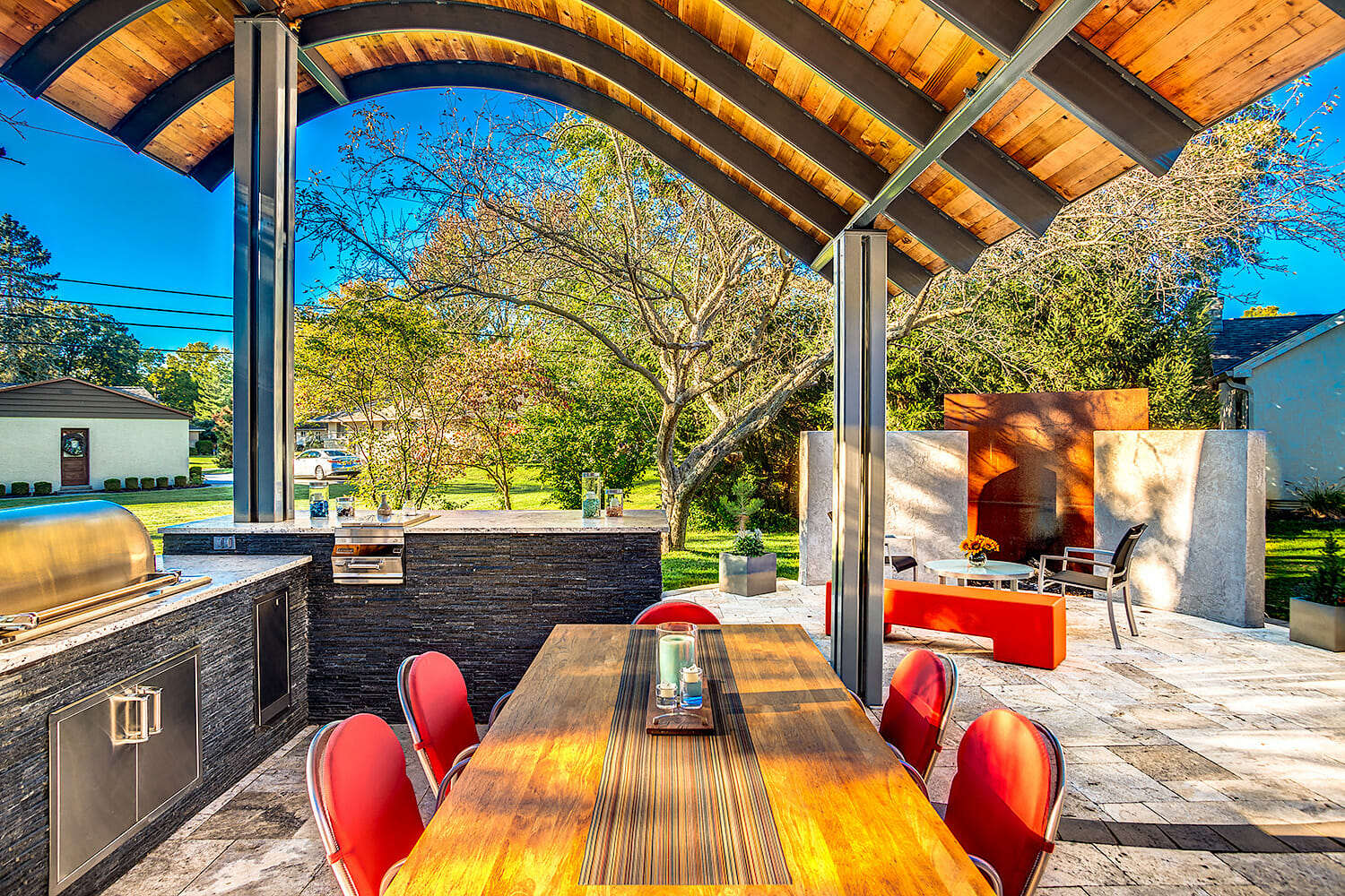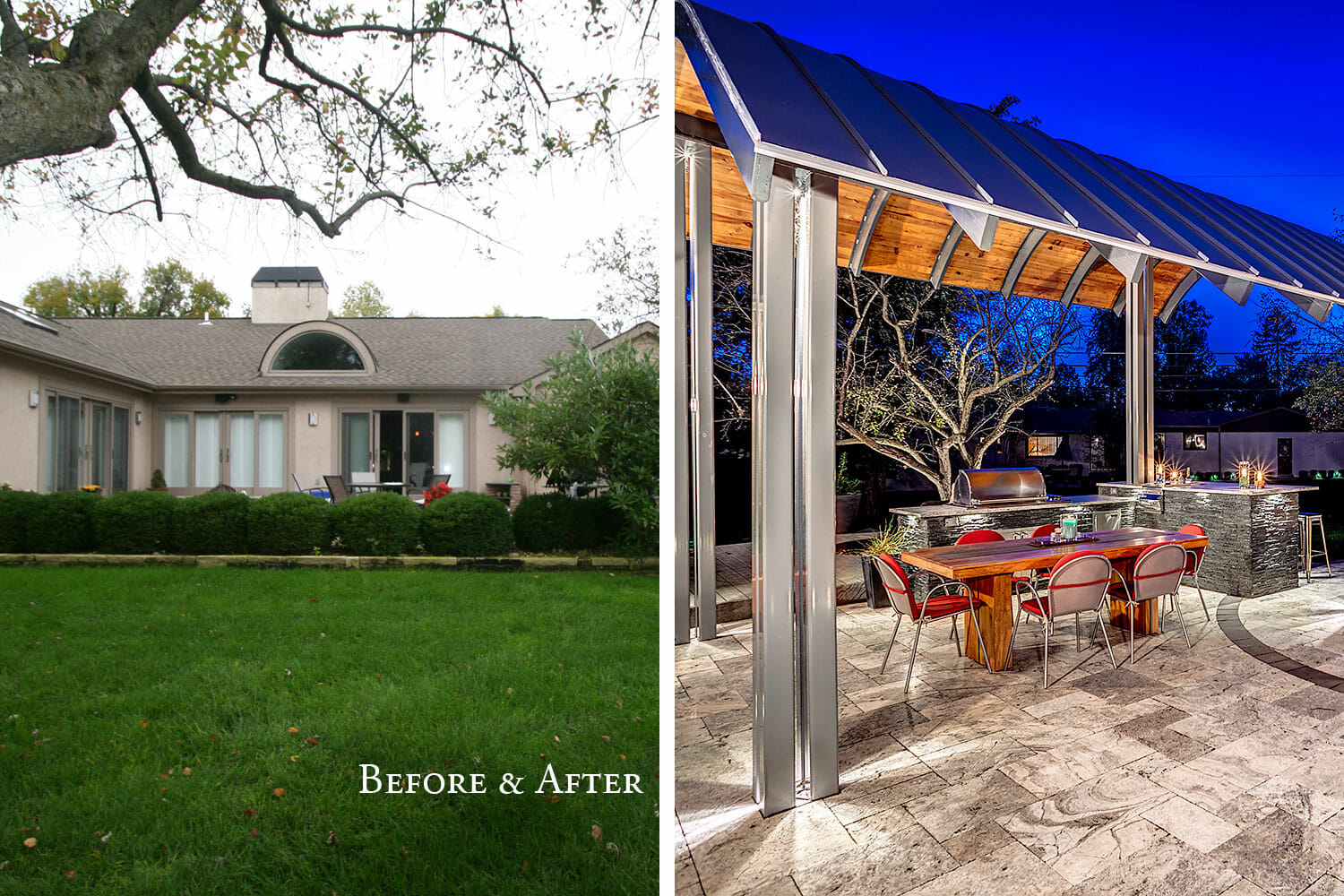 This once bland outdoor living space was transformed into an award winning show stopper by seamlessly blending the homeowner’s modern architectural style with the landscape. Unique features such as a corten steel fire feature and a curved roof structure provide the setting for this upscale entertaining space. The new patio was constructed of silver travertine with black brick accents, complimented by an outdoor kitchen made of like materials. Cedar planking was used on the underside of the roof structure to provide warmth and richness to an otherwise cold space. This new outdoor room is sure to wow for years to come!
